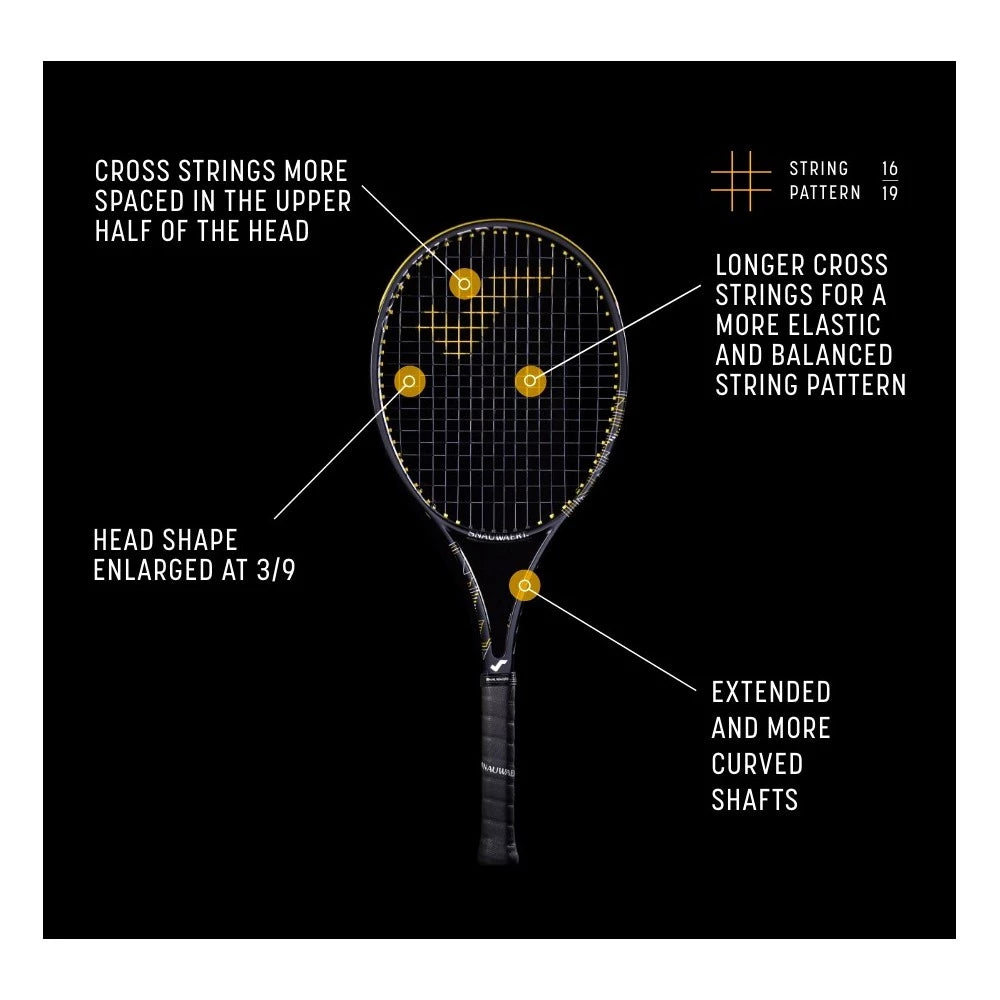 We hebben de horizontale snaarlengte in het middengebied en de afstand tussen de horizontale snaren aan de bovenkant van het racket vergroot wat resulteert in meer spin en power.