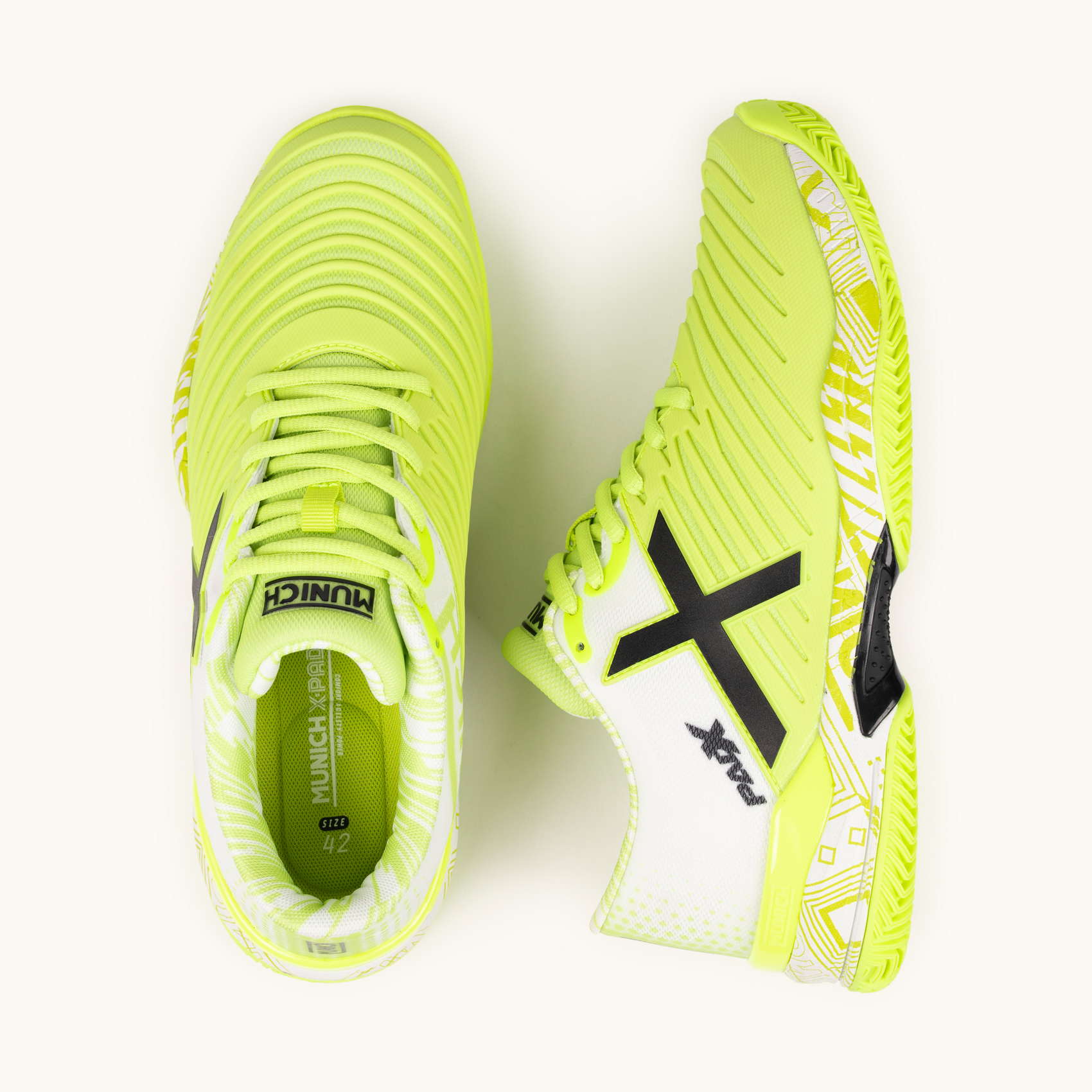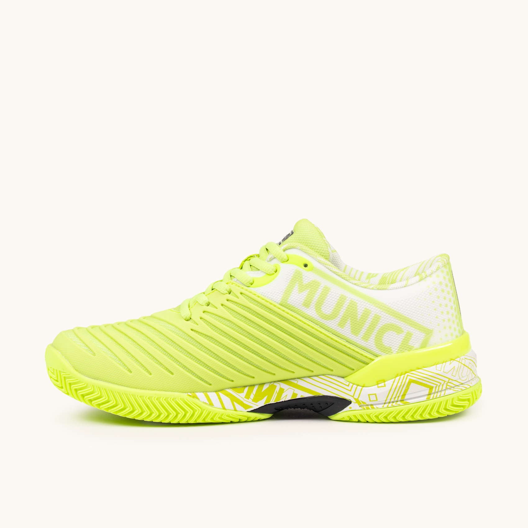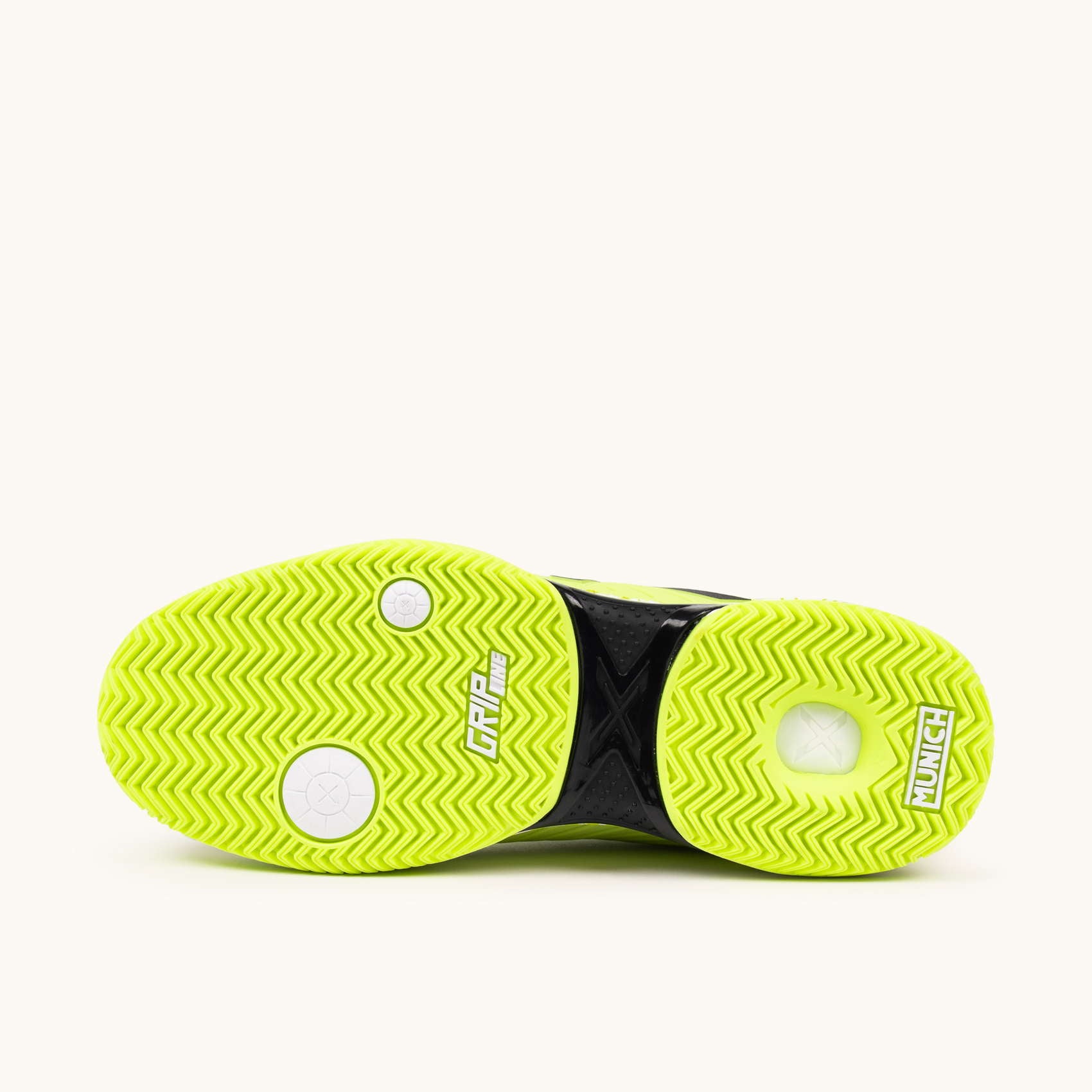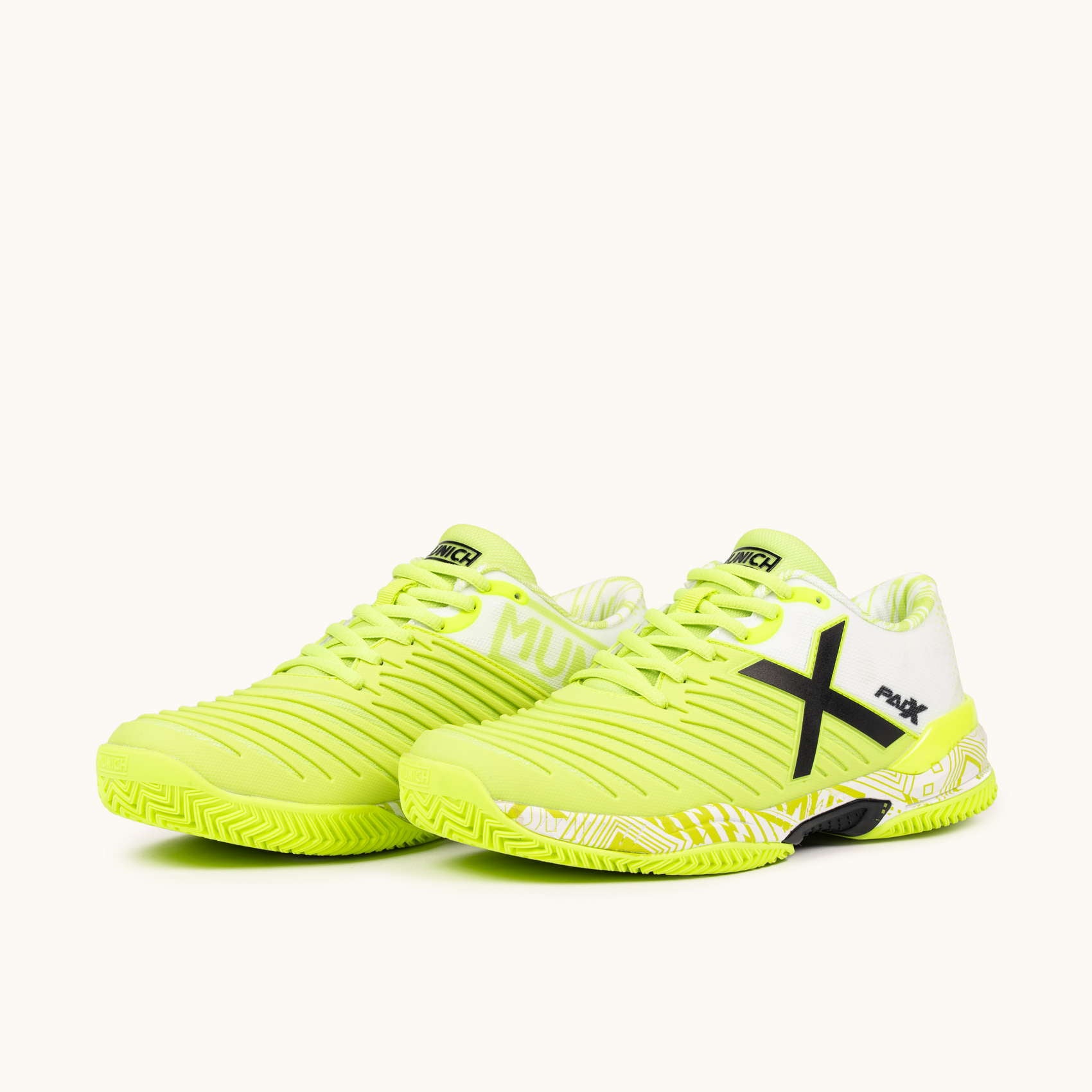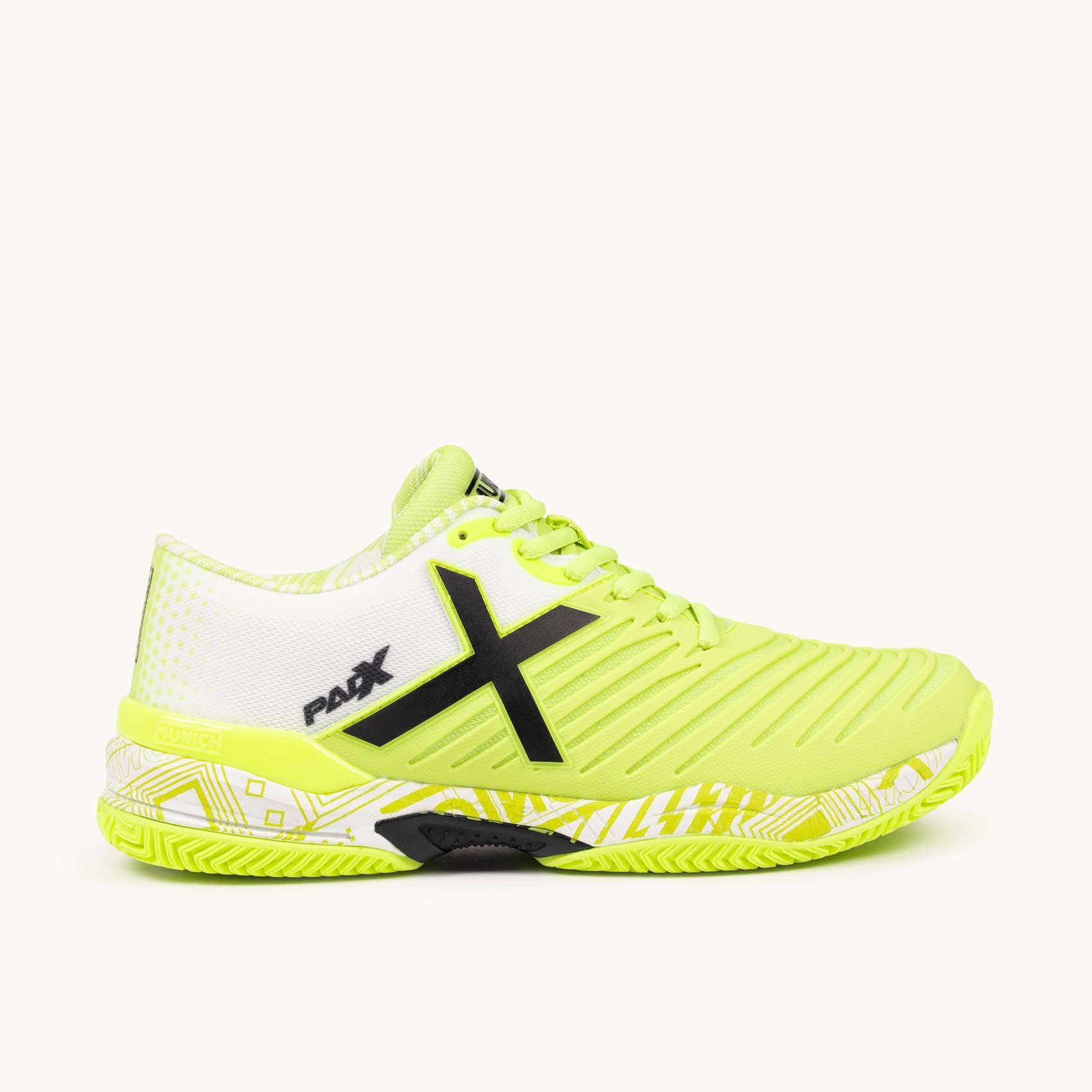Glijden op de padelbanen. Het PAD X-model wordt gekenmerkt door zijn wreefweerstand dankzij het geïnjecteerde TPU-stuk dat de stofbasis structureert en weerstand biedt tegen schuren op de meest belaste plekken.