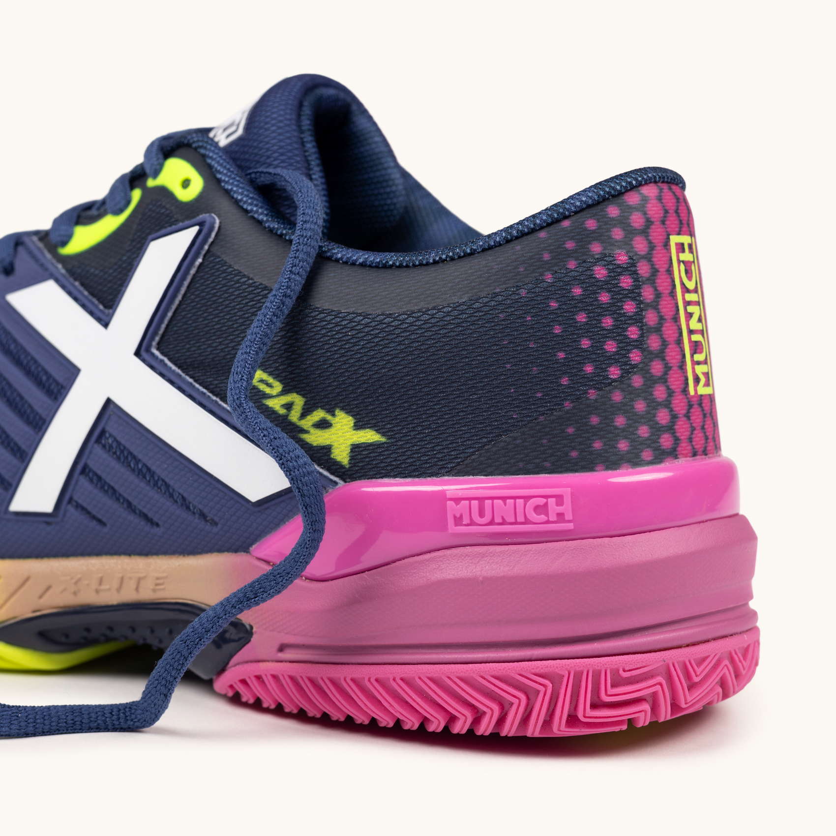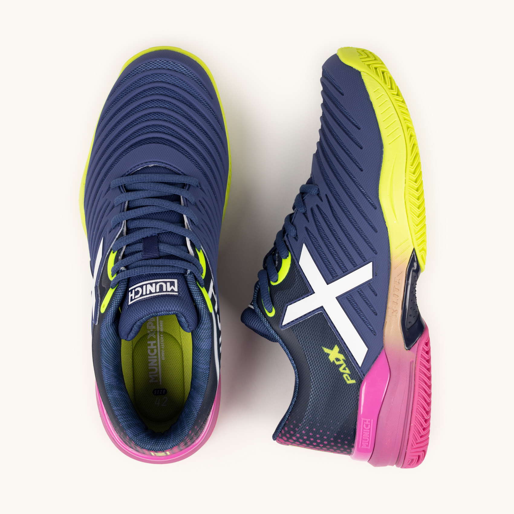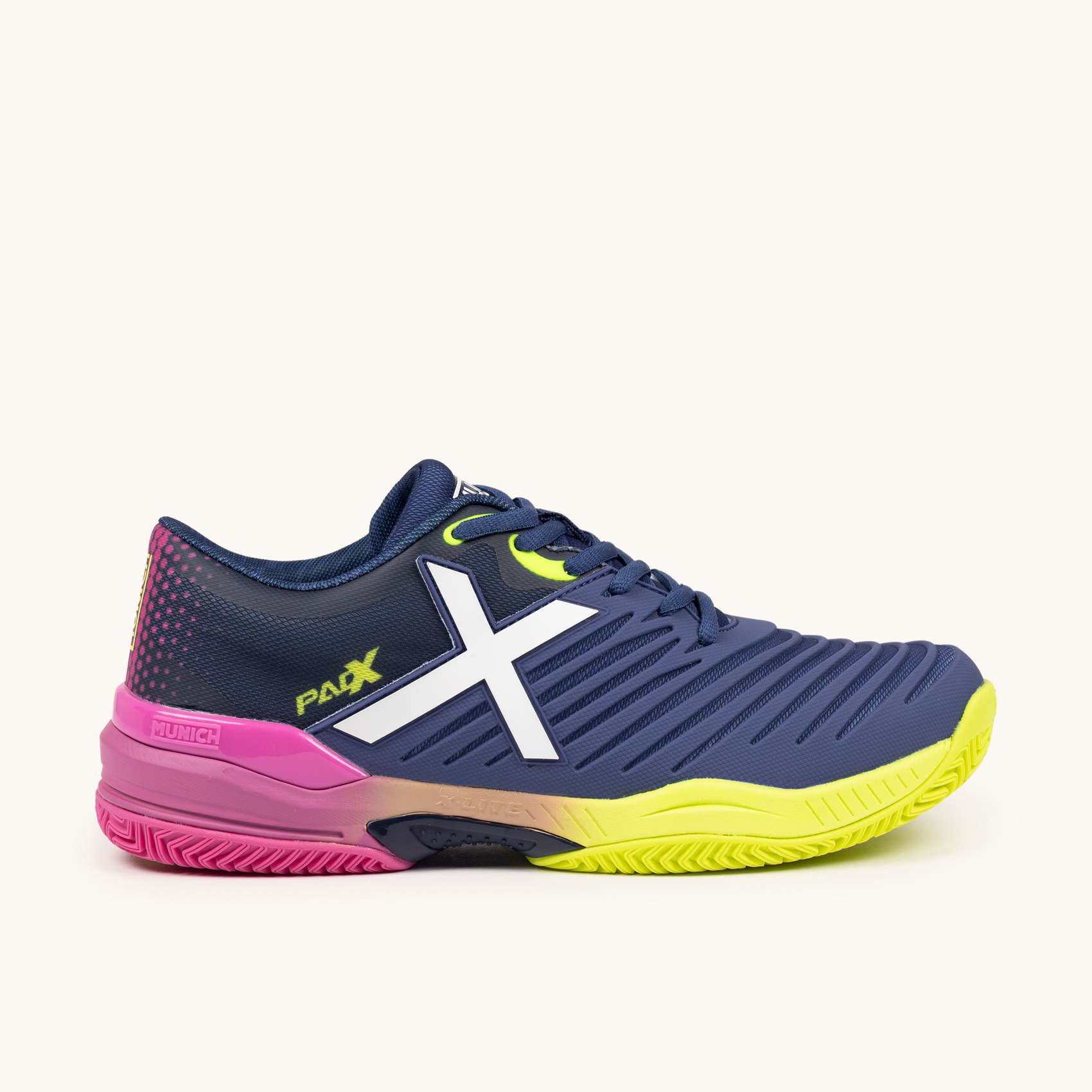 Glijden op de padelbanen. Het PAD X-model wordt gekenmerkt door zijn wreefweerstand dankzij het geïnjecteerde TPU-stuk dat de stofbasis structureert en weerstand biedt tegen schuren op de meest belaste plekken.