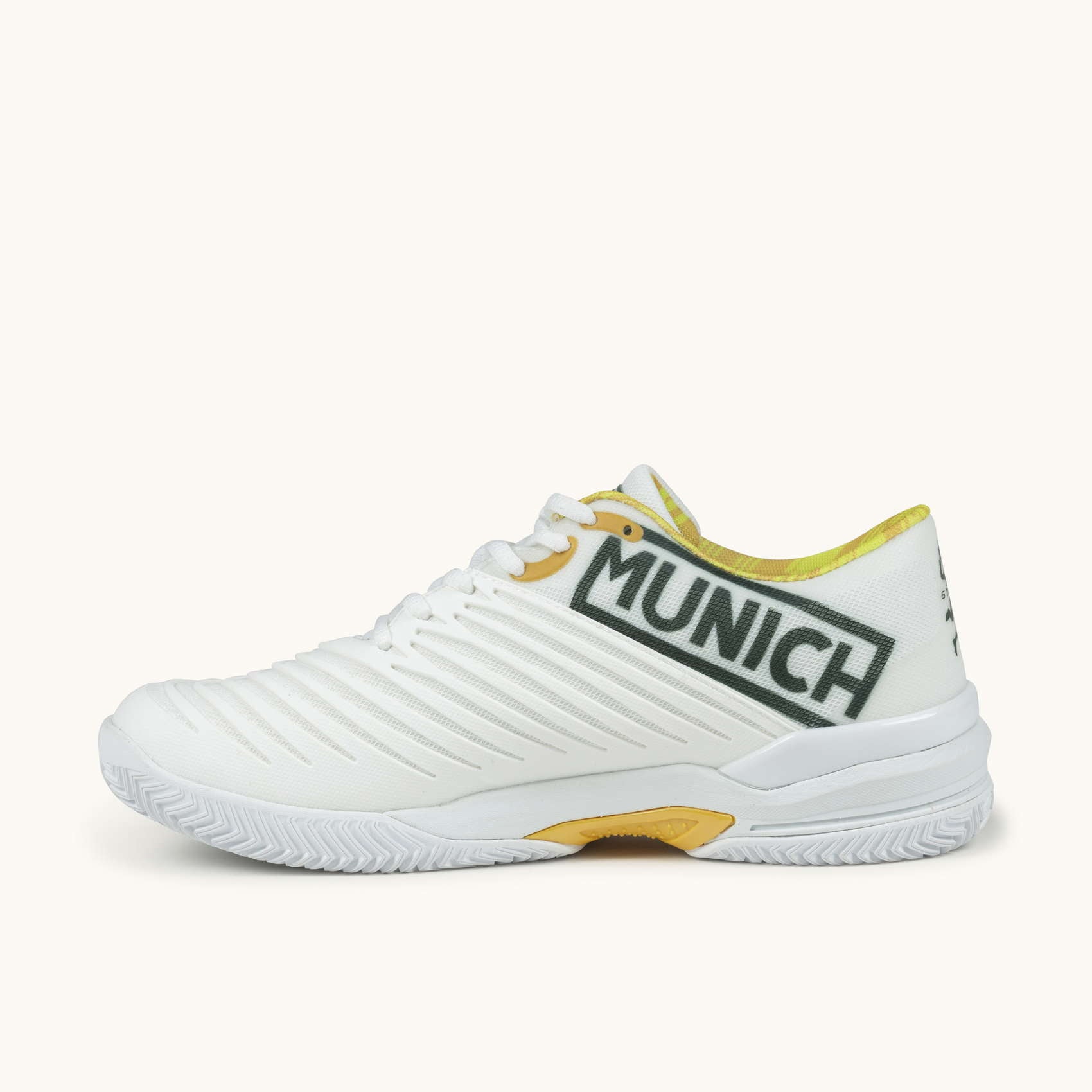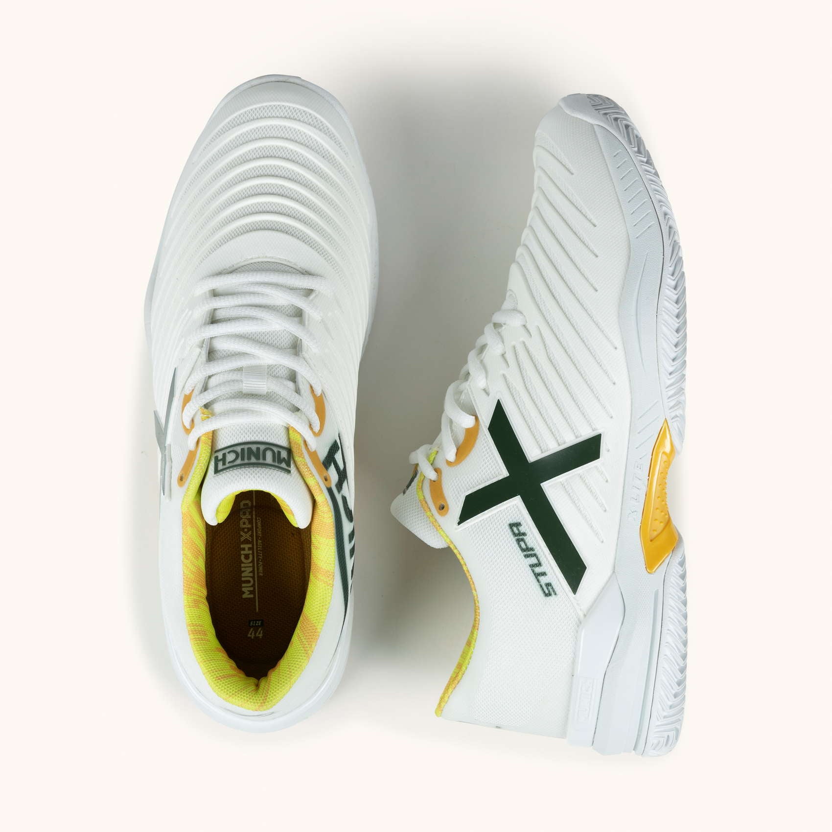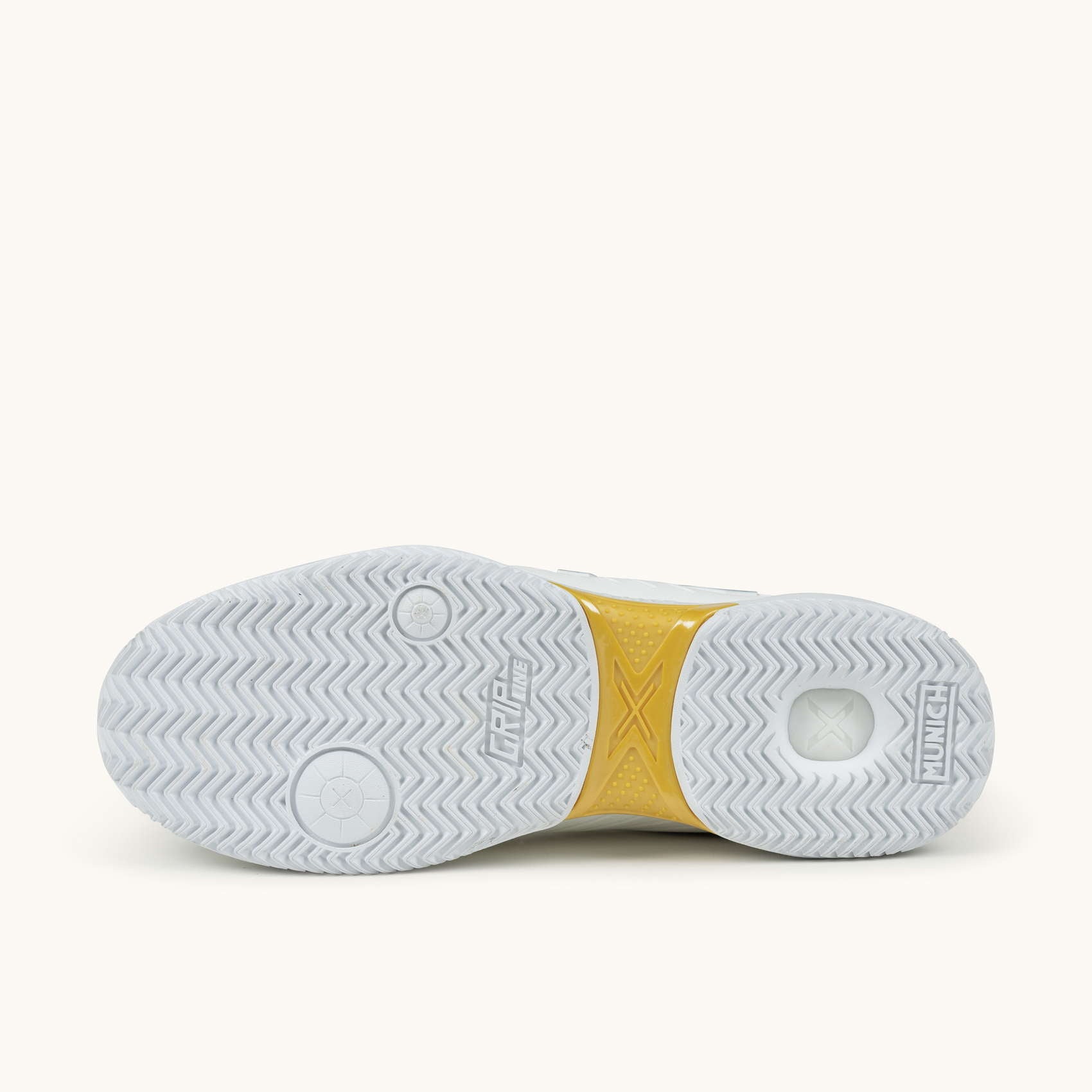 Glijden op de padelbanen. Het PAD X-model wordt gekenmerkt door zijn wreefweerstand dankzij het geïnjecteerde TPU-stuk dat de stofbasis structureert en weerstand biedt tegen schuren op de meest belaste plekken.